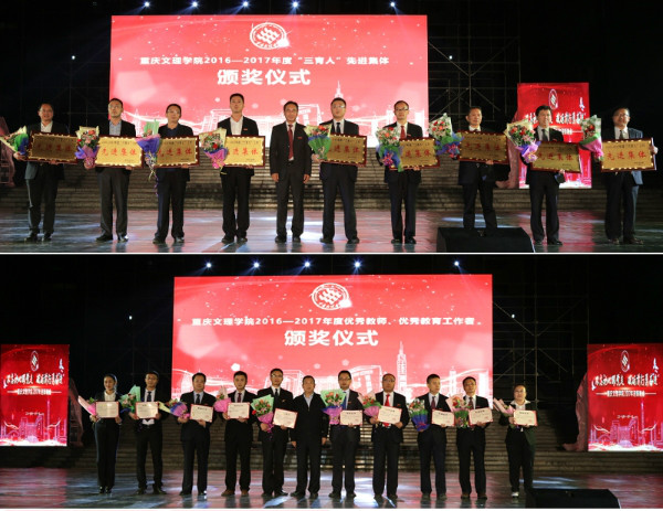 我院喜获学校2016-2017年度“三育人”先进集体;庞敏,夏晶晖、黄丽霞三位老师荣获2016-2017年度优秀教师;邹容老师获得首届“金果源”学生最喜爱的教师。