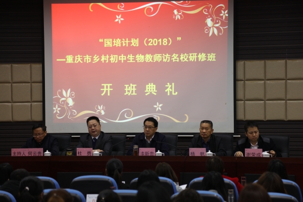 11月6日上午,“国培计划(2018)”—重庆市乡村初中生物教师访名校培训开班典礼在重庆文理学院培训学院114教室隆重举行,来自重庆市28个区县中小学的50位学员参加开班典礼,出席的领导有党委常委、副校长漆新贵教授,继续教育学院培训学院院长杜勇,林学与生命科学学院院长杨帆教授和林学与生命科学学院党总支书记谢荣成。由继续教育学院培训学院党总支书记、副院长何云贵教授主持。