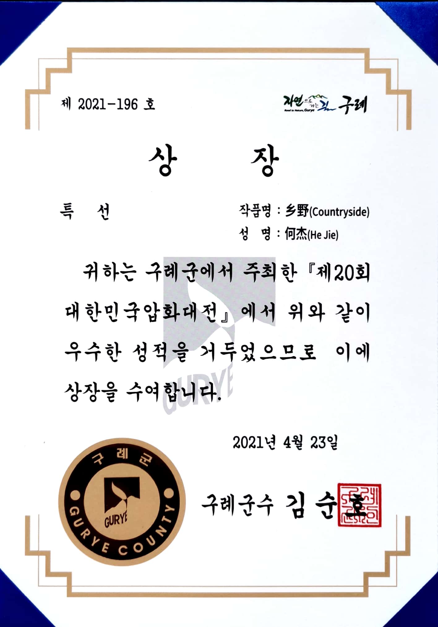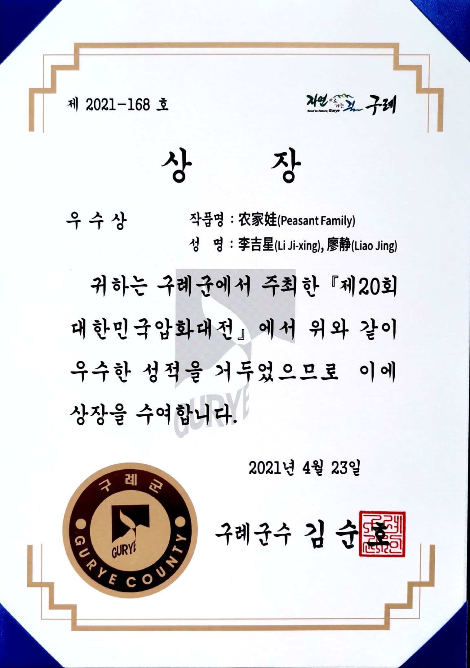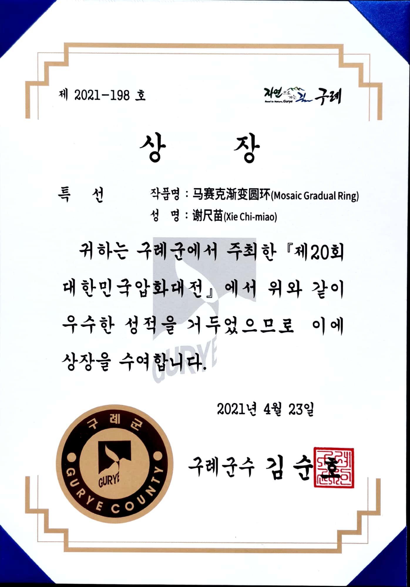 近日,由韩国农业部、韩国压花协会主办,邱礼郡政府和邱礼郡农业技术中心承办的第20届韩国国际压花大赛在邱礼郡压花博物馆举行颁奖典礼。我校园林与生命科学学院选送作品获2项银奖,3项特选奖佳绩。其中16级园林专业李吉星作品《农家娃》及18级园林专业陈纤纤作品《冰雪屋缘》获银奖,16级园林专业何杰作品《乡野》、18级园林专业姜巧臻作品《故宫▪雪》及18级风景园林专业谢尺苗作品《马赛克渐变圆环》分别获特选奖。