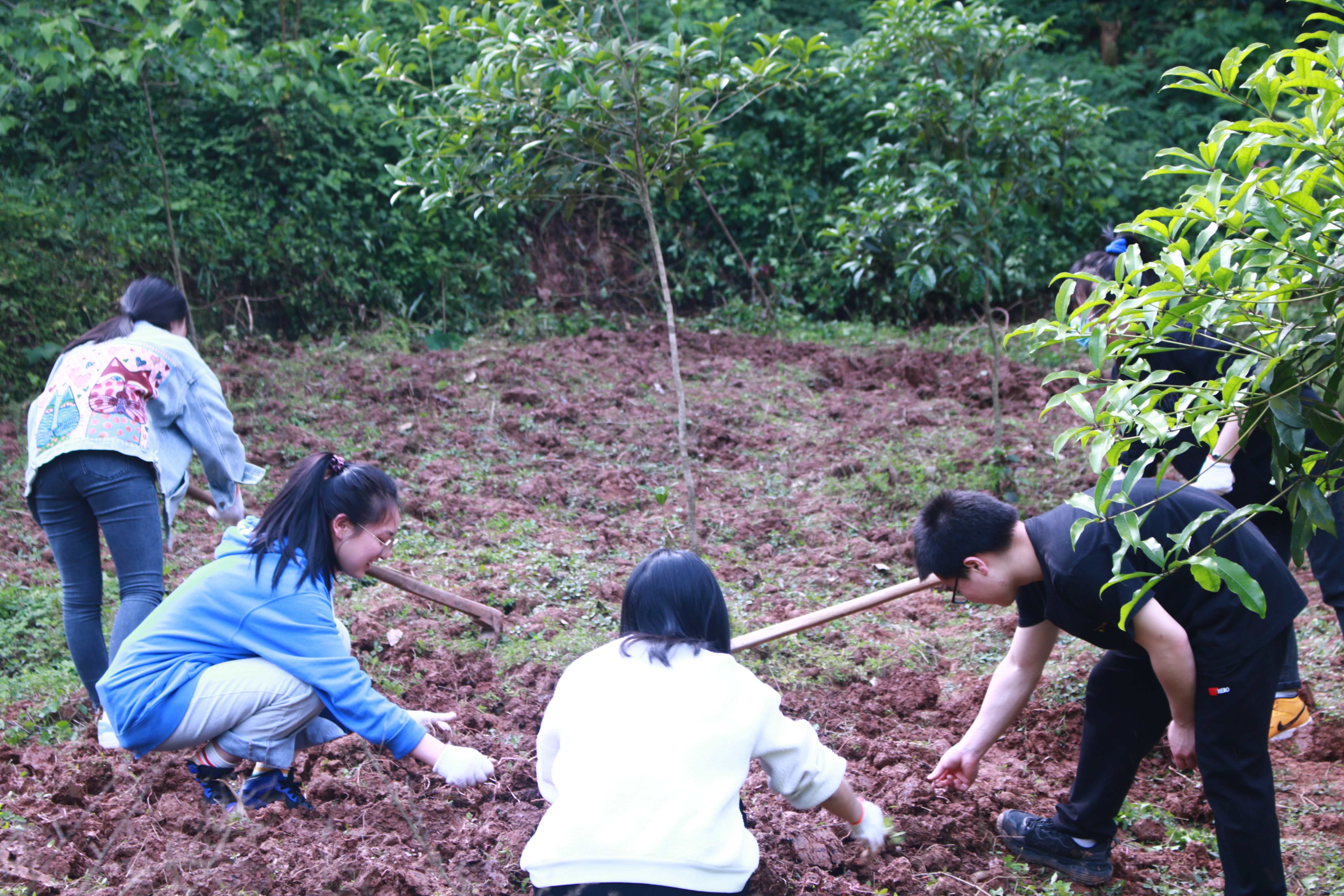 系主任黄科示范了翻土、挖沟、起垄、移栽等劳动技能。随后学生分组劳动,拔野草、抡锄头、量土地、理小苗、做记录,有模有样,手脚沾满了泥土,粉脸笑开了花。