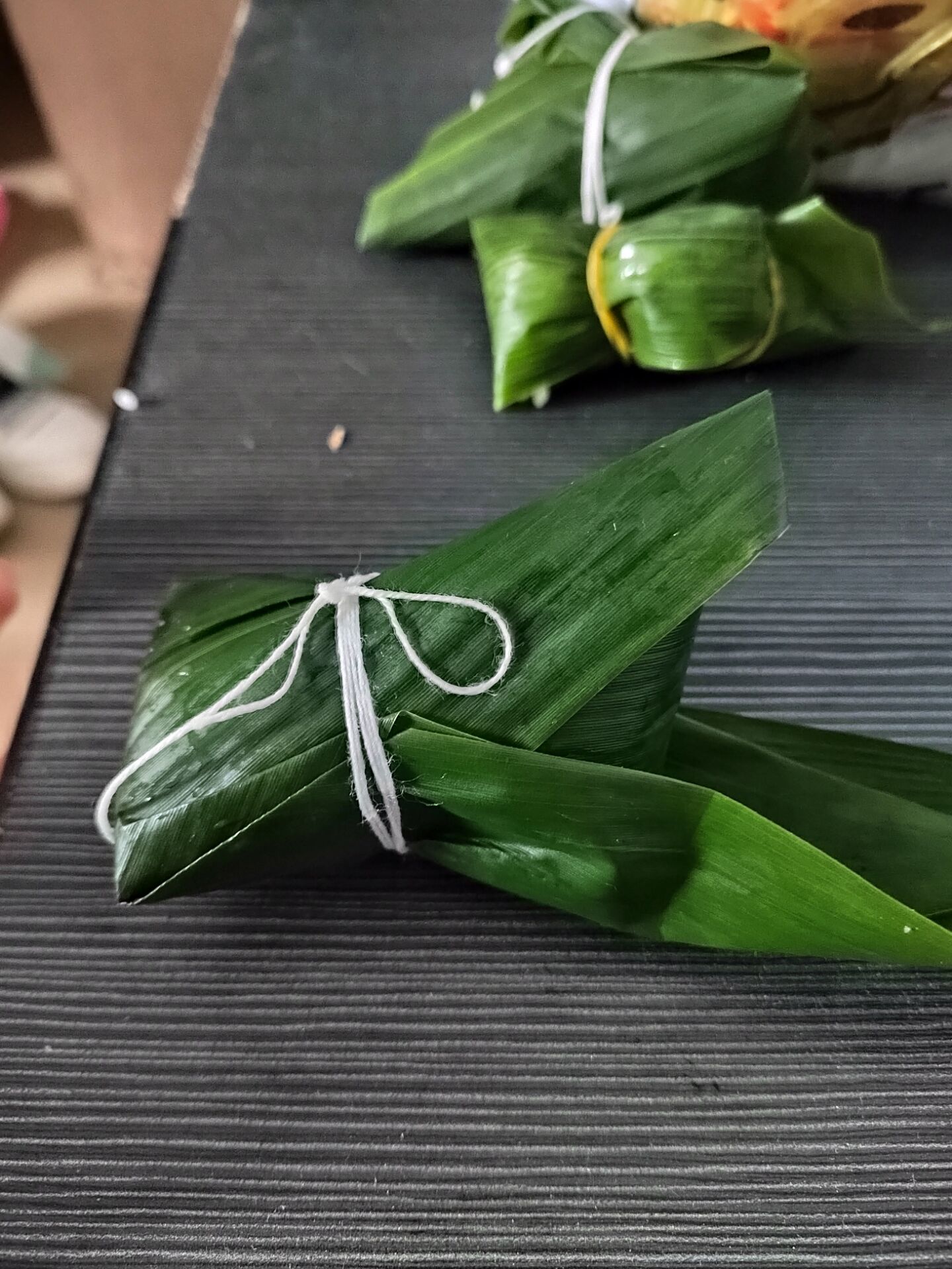 折粽叶、填糯米、加配料、裹叶子、系线包粽子,各种形状的粽子新鲜出炉。按照膳食宝塔原理,在传统粽子的基础上,通过添加肉、蛋、果等多种健康食材,降低碳水含量,丰富口感,将健康和美味融入粽香中。