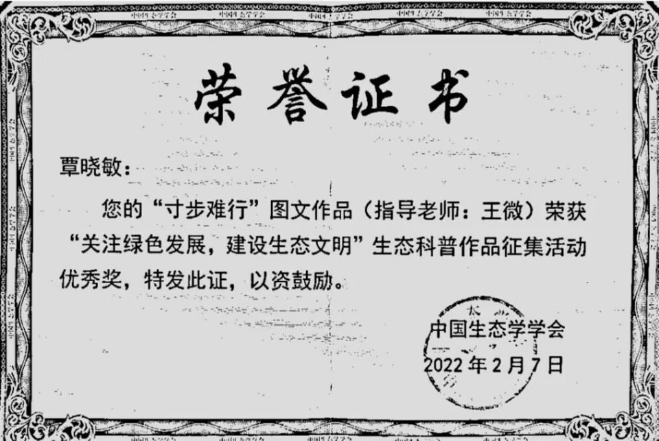 我院园林专业覃晓敏同学在王微老师指导下创作的图文作品《寸步难行》,获得“关注绿色发展,建设生态文明”生态科普作品征集活动优秀作品奖。该活动由中国生态学学会举办,旨在提高公众生态环境意识和科学素养水平,推进绿色发展和生态文明建设,共建青山常在、绿水长流、空气常新的美丽中国。
