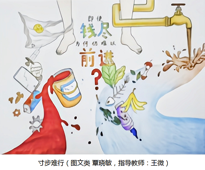 作品以“保护环境,拒绝乱排乱放”为主题,生动地把排放到河流以及自然环境中的污染物化作束缚在人类脚上的枷锁,并附上“即使‘钱尽’为何仍难以‘前进’?”的发问,发人深省。
