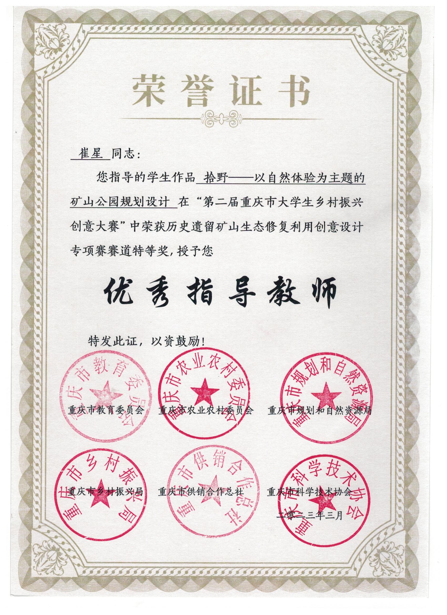 近日,由重庆市教育委员会、重庆市农业农村委员会、重庆市规划和自然资源局、重庆市乡村振兴局等部门联合主办的第二届重庆市大学生乡村振兴创意大赛获奖名单公布,园林专业学生吴心怡、聂星宇、李淼等13位同学的作品分别获得特等奖、三等奖,指导教师崔星获评“优秀指导教师”。