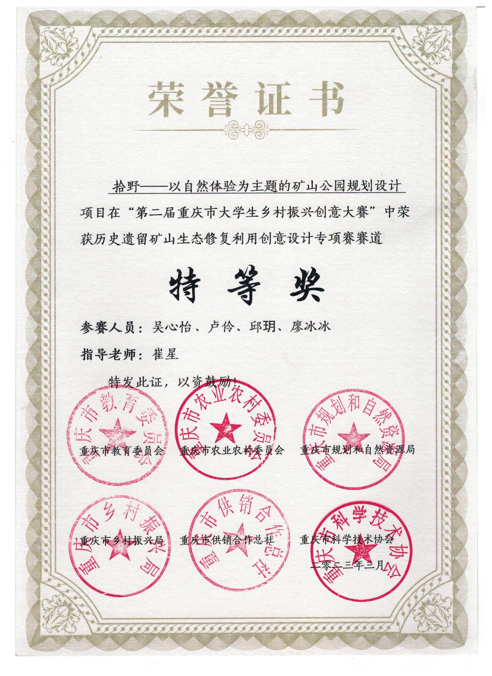 近日,由重庆市教育委员会、重庆市农业农村委员会、重庆市规划和自然资源局、重庆市乡村振兴局等部门联合主办的第二届重庆市大学生乡村振兴创意大赛决赛获奖名单公布,园林专业学生吴心怡、聂星宇、李淼等13位同学的作品分别获得特等奖、三等奖,指导教师崔星获评“优秀指导教师”。