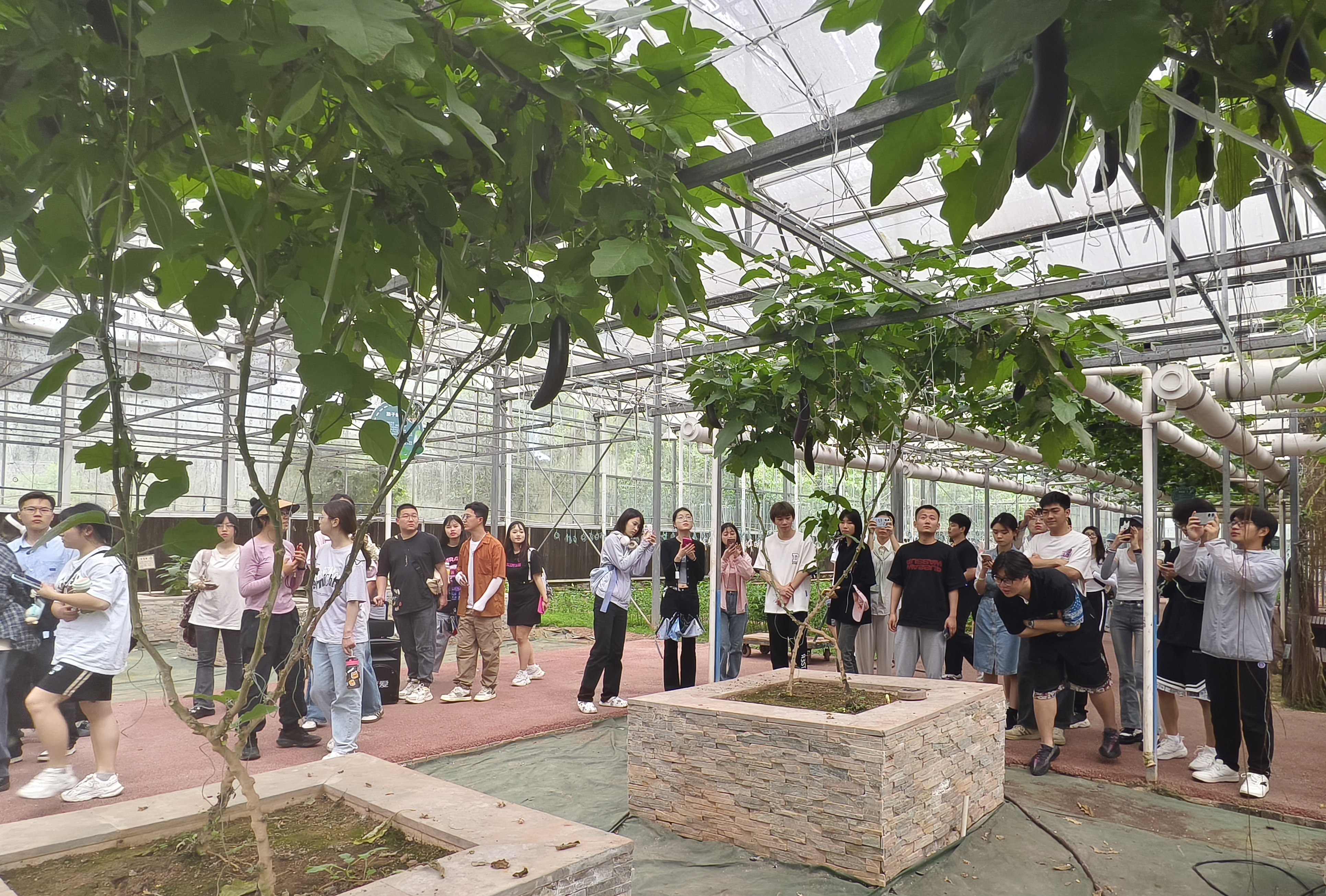 随后,学生们参观了潼南国家农业科技园区蔬菜博览中心,了解了果蔬有机土栽培、水培、雾培、袋培、立式等多种设施栽培技术,并在刘婷老师的介绍下,对各种蔬菜的新奇品类、种源由来、生长周期以及种植技巧有了进一步的认识。