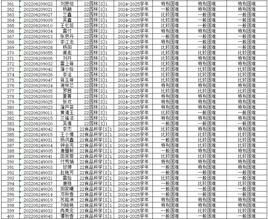为切实保证国家高等学校资助政策和措施真正落实到家庭经济困难学生身上,公平、公正、合理的分配资助资源,根据上级有关文件精神和《重庆文理学院本科生家庭经济困难认定管理办法》,学院开展了2024—2025学年本科生家庭经济困难认定工作。 经各年级(专业、班级)民主评议,学院认定,现将认定结果公示如下,公示期为9月20日-9月23日,公示期间如有异议,请到学院学生奖助工作评审领导小组反映情况(励德楼202室)。
