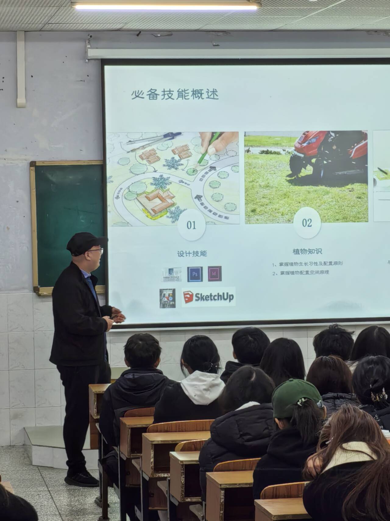 讲座中,李继刚从自己的成长经历出发,为同学们剖析了园林专业的现状和未来发展方向,详细讲解了园林专业设计类岗位的就业前景与职业要求,以真实项目为载体,阐述了园林景观如何在城市生态建设与文化传承中发挥关键作用。他结合多个经典园林案例,从设计思路、空间布局到植物配置,生动阐释了创新设计方法与技巧,分析如何将生态环保理念与美学追求完美融合,打造兼具功能性与观赏性的园林空间。