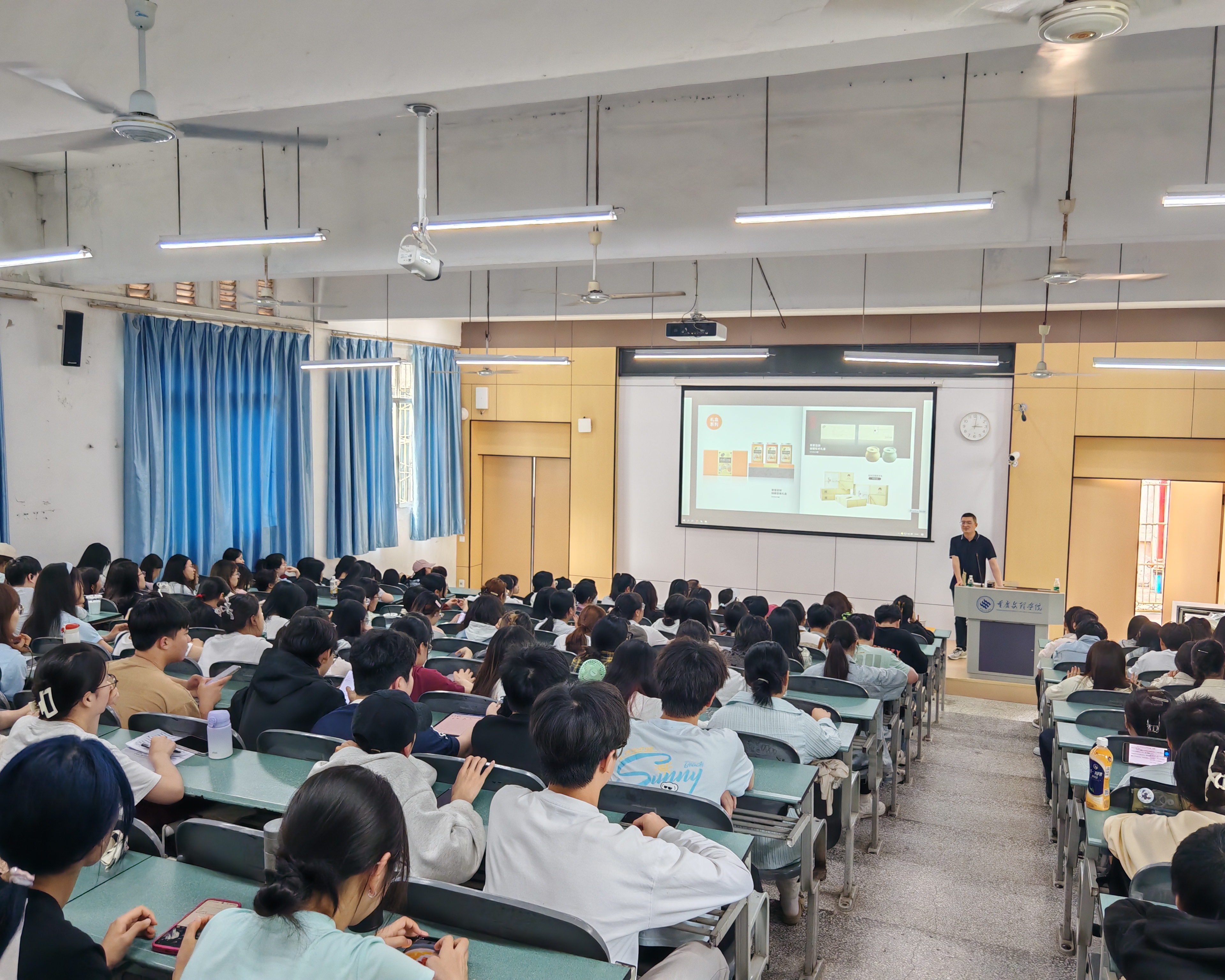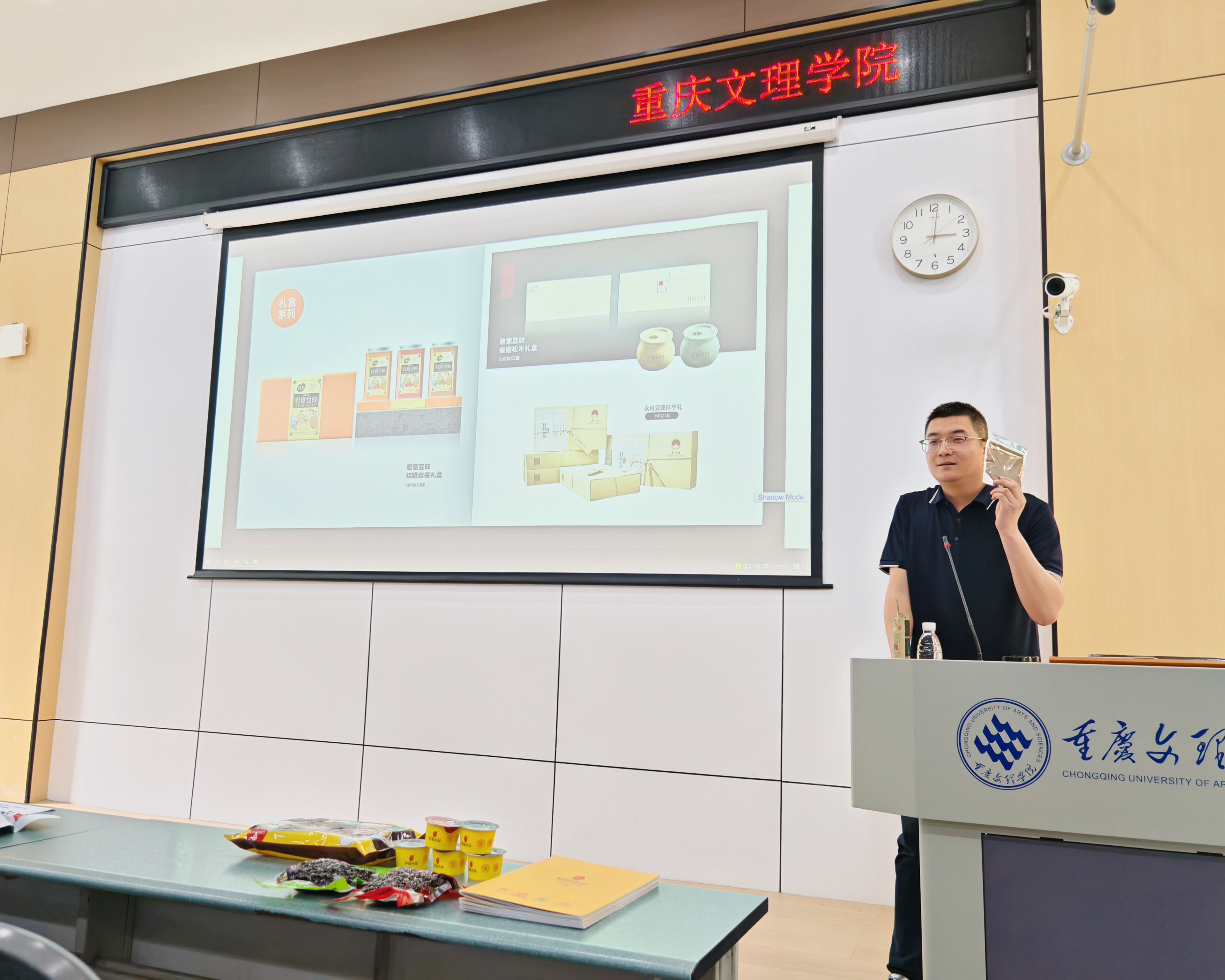 会上,菽乡(重庆)农业科技有限责任公司大客户部经理朱亚豪详细介绍了永川豆豉酿制技艺这一国家级非物质文化遗产,并结合公司产品分享了创新案例和当前存在的“卡脖子”问题。随后,菽乡(重庆)农业科技有限责任公司财务管理中心总监孔祥兵发表讲话,表达了对本次大赛的殷切期望,希望同学们能通过此次比赛为永川豆豉产业发展带来新思路。紧接着,张美霞详细介绍了大赛的流程与要求。最后,在互动环节,同学们就开发新产品品类、消费场景、利用新兴技术提升品质等问题与企业相关人员进行了深入探讨。