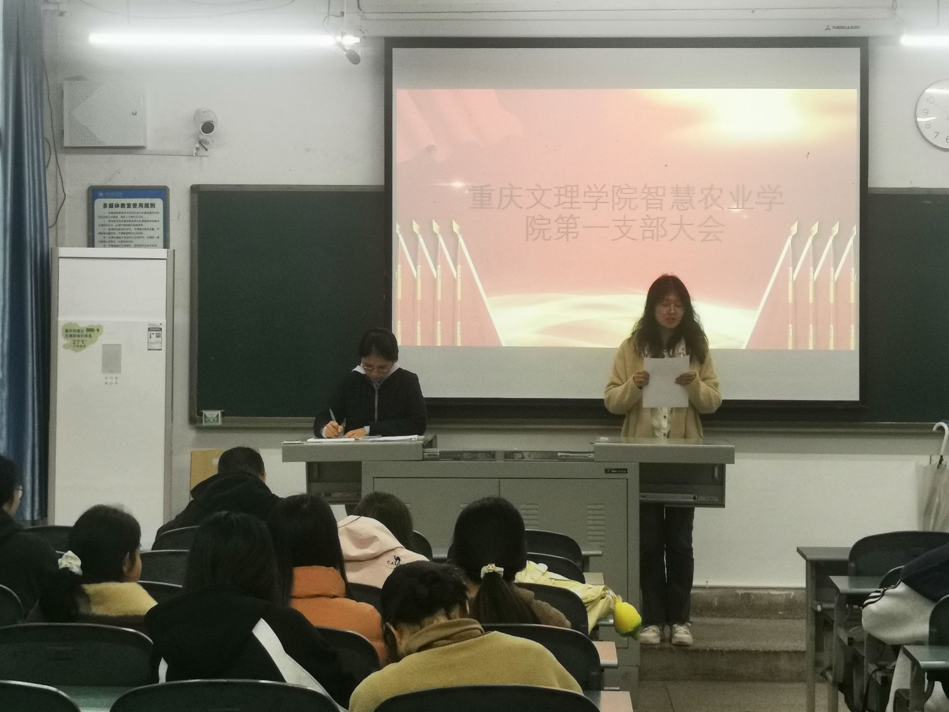 2025年11月14日,mansion88明升学生第一党支部召开党员发展大会。宋卿、郑理、刘筱、黄科等10位教师党员、支部全体学生党员以及入党积极分子共计43人参加本次会议,会议由支部书记宋卿主持。